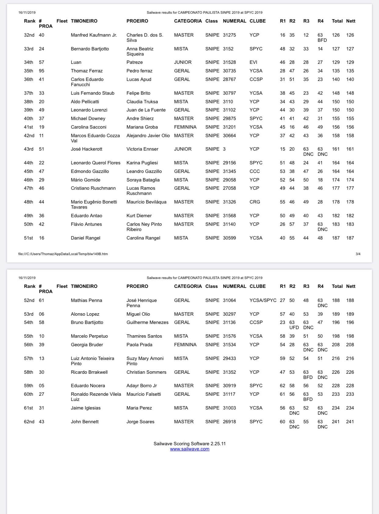 Seguem os resultados provisórios até a 4ª regata do Campeonato Paulista da Classe Snipe 2019.