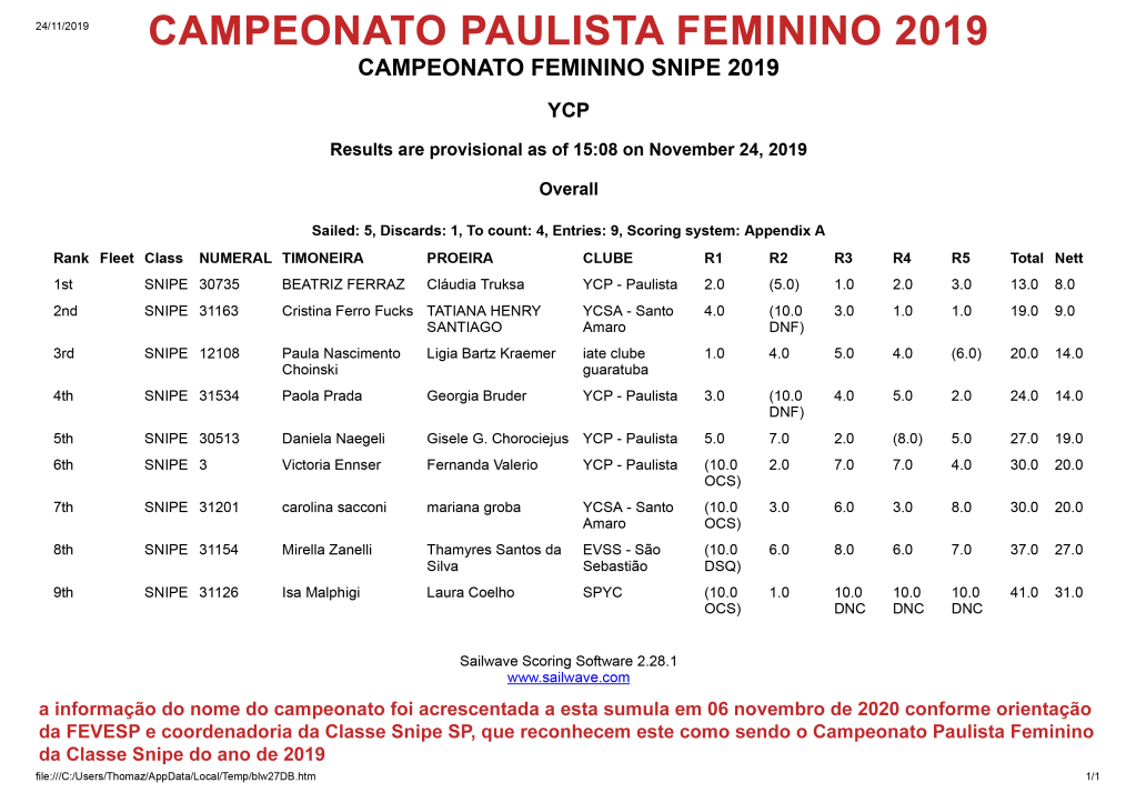 Lista das 3 primeiras colocadas do Campeonato Paulista Feminino da Classe Snipe 2019, disputado nos dias 23 e 24 de novembro de 2019.